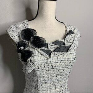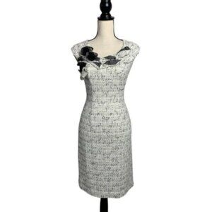 Kay Unger Tweed Sleeveless Floral Appliqué and Ruffle Neckline Sheath Dress