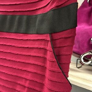 This elegant Kay Unger New York dress features a stunning deep red textured fabric with horizontal ridges, creating a sophisticated and flattering silhouette. The black waistband accentuates the waistline, adding a stylish contrast. Perfect for formal events, work, or evening occasions.
