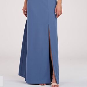 The Bowie Gown features stretch crepe fabric, a one shoulder design with pleated detail, and a pleated sash detail at the back, which can be worn inside or outside the detachable belt.