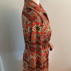 Maxi Vintage dress by Kay Windsor USA made 1960/1970’s era back zipper, left side slit 18 inches up from bottom for easy walking. Collared. 56 inches long and 18.5 inches pit to pit lying flat. Ties belt . Size tag worn so hard to see size but 6-8 is appropriate with measurements. Long sleeves. Perfect Fall dress!!! Excellent condition!