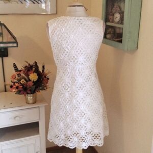 Beautiful sleeveless lace dress with wrap bodice. Seam under chest, A-line skirt. Fully lined. Pull over style. Size M measures 38 at chest, 30 under chest, 40 at hips, 37 long from shoulder to scalloped hem. Lovely and feminine, the perfect piece for your special occasion.