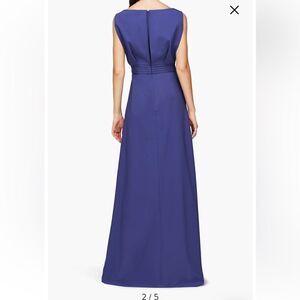 Bateau neck, pleated waistband, a-line floor length skirt, cap sleeve, stretch.