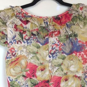 Chic Kay Unger floral dress with ruffled tiered sleeves and a gathered skirt. Vibrant colors create a lively look. Ideal for any occasion. 72% cotton and 28% silk. Size 6.