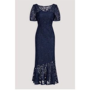 The epitome of elegance, this navy tea length dress crafted entirely from rose bouquet lace with a statement sleeve and asymmetric illusion trumpet will make an entrance at your next cocktail event.