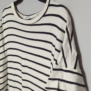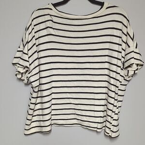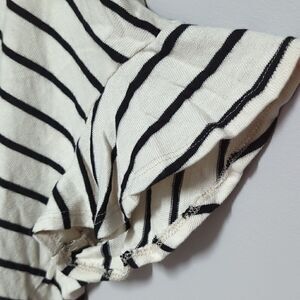 White with black stripes. Dropped shoulder with ruffle detail.