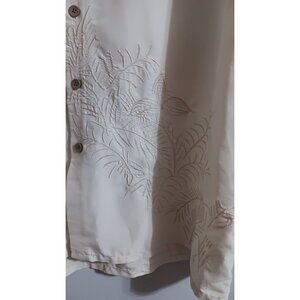 Collar. Button down front closure. Short sleeves. Front embroidered palm trees. Modal/Polyester material. Korea. Beige color. Chest 50". Length 31". Casual. Event. Occasion. Wedding. Date. Cruise.