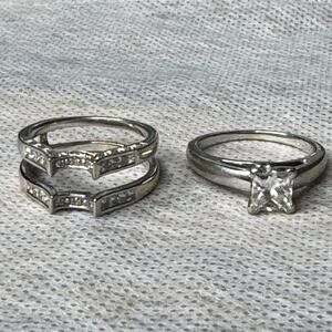Kays Jewelry Ring Set. One owner. Valued at over $6k. Pristine white gold. Princess Engagement Ring with Wedding band Ring Enhancer. Engagement Ring is one Carat with colorless quality, absolutely stunning in person! I cannot find the diamond count for the wedding band/enhancer but it does have four diamonds on either side