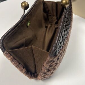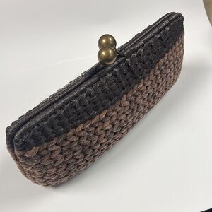This is a beautiful Kayu Handmade Brown Rope and Straw Kisslock Clutch Bag Purse. In excellent condition. Oiled brass large kisslock ball closure. Fully lined in brown cotton with a slip in pocket. Dark chocolate brown rope and straw make this structured, interior metal frame bag a beautiful addition. Fits an iPhone and much more! No issues. No odors, no tears, no stains.