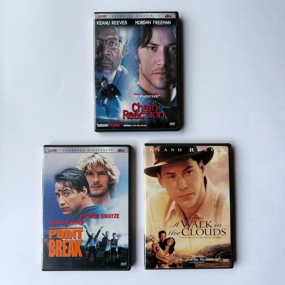 Set of three DVDs featuring Keanu Reeves. Includes 'Chain Reaction', 'Point Break', and 'A Walk in the Clouds'.