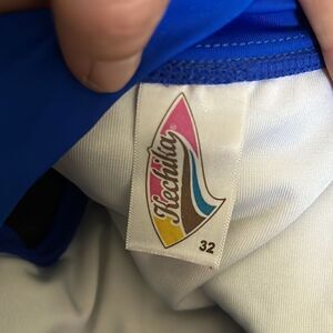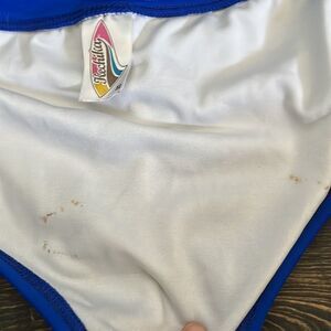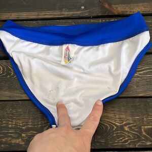 Runs like a small see measurements picts have some inside stain from when they were washed and air hanged to air dry with some wood and metal clips and got little rust on the inside on the bikini other than that great condition