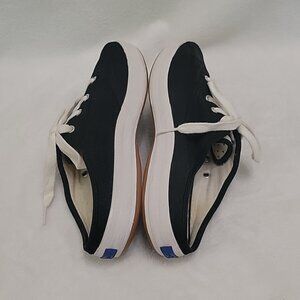 This is a cute pair of black Keds sneakers in a size 8. The shoes have lower backs. They are in nice condition with minor wear.
