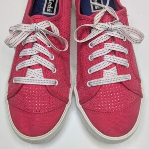 Pre-owned.Keds Celeb red perforated canvas lace up sneakers. Clean with no notable wear. Minor scuffing on the white rubber sides. Please zoom to view all pictures carefully for condition and wear.