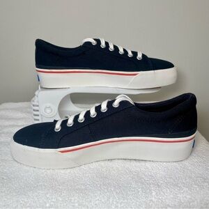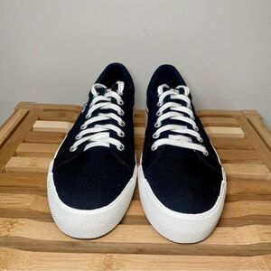 Navy canvas sneakers with white rubber sole. Red stripe accent. Ideal for everyday style.