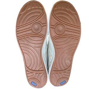 The Keds Leather Lace-Up Oxford Sneaker Contrast Stripe in size 7.5 features a low top design with a lace-up closure for a secure fit. Made with beige leather upper material and fabric lining, these sneakers offer a combination of comfort and style. The rubber outsole provides slip-resistant traction, making them suitable for casual wear and walking activities. The mesh and ribbon stripe accents, along with the logo detailing, add a trendy touch to the shoe, perfect for a coastal grandma or retro-inspired look.