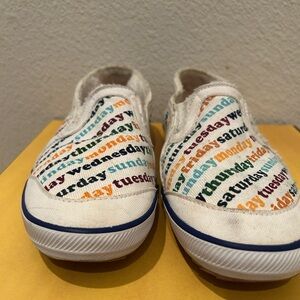 Vibrant slip-on sneakers with days of the week print. Easy to wear and stylish.