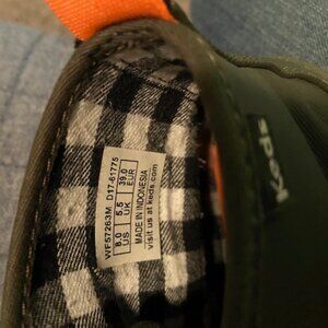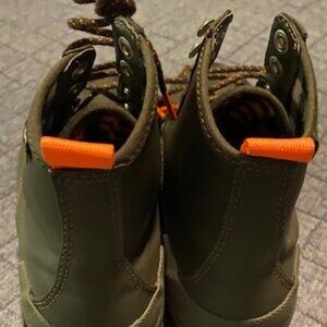 Cutest Lightweight Duck boots. The Olive green is coming off strong in the photos. Light accents of orange on the laces and ankle tabs. These are in very good used condition.
