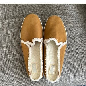 Cozy slip-on design. Soft tan exterior. Plush white lining. Durable white sole. New without tags.