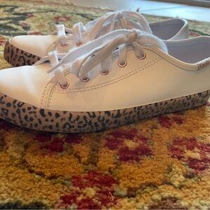 Girls Keds sneakers in white. White leather on the top. Features stylish cheetah/animal print sole. Worn a handful of times