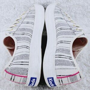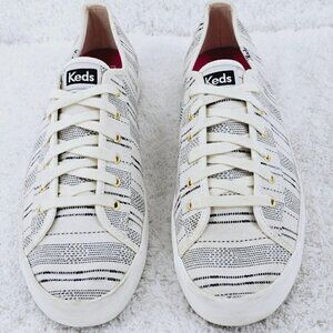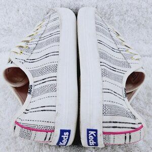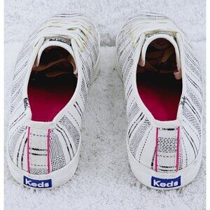 Stylish Keds sneakers with a white base and black stripes. Comfortable and trendy design.