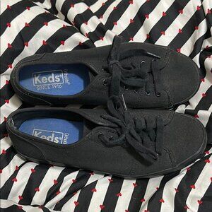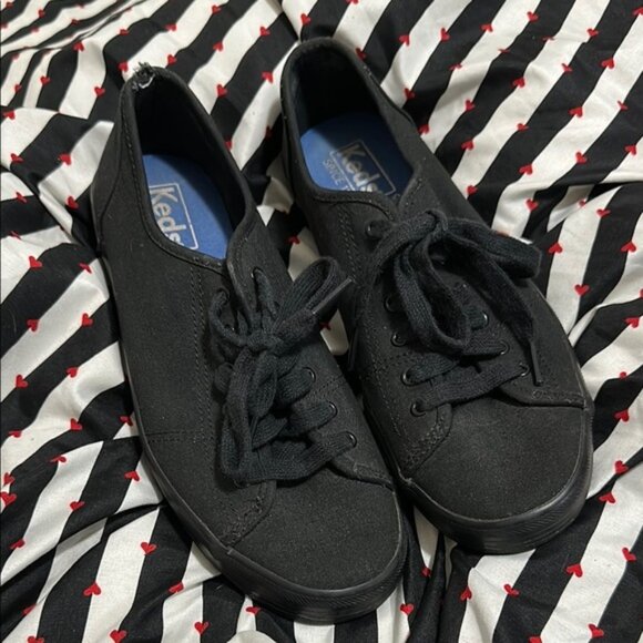 Step out in style with these classic black canvas sneakers from Keds. Perfect for casual outings, these shoes offer comfort and durability. Signs of wear shown in photos, including small tear on heel of right shoe, slight scuffing and noticeable use on inner and outer soles. Blue Keds symbol removed from outer heel.