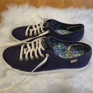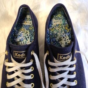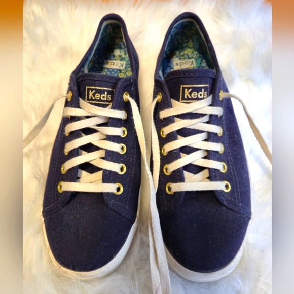 Stylish Keds athletic shoes in navy. Features white laces and gold eyelets. Perfect for casual wear.