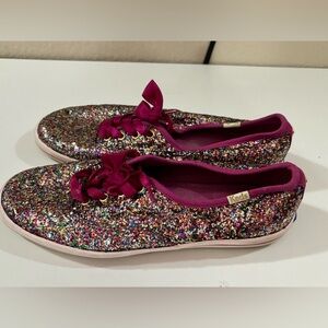 Fuchsia trim with ribbon laces and multi color glitter. Comfortable classic Keds sneakers with an extra pop of sparkle. Iconic Kate Spade logo on back.