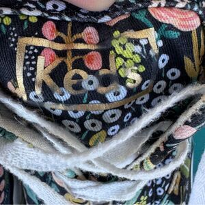 Keds X Rifle Paper Co. Anchor Sneaker in Lourdes Floral print. Ladies' size 7. In very good condition functionally with light marks to outsoles throughout both shoes, light discoloration to insoles, Fading of gold logo at tongues, multiple areas of damage to back logo plate at heel of left sneaker and sharpie marks/ bleeding of ink to inside of both shoes (does not go through to outside.) Original shoelaces show pilling. Please see all photos.