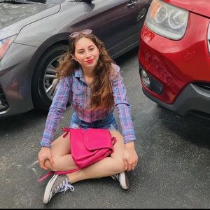 Super cute keds plaid button down in pink and blue :) stone style buttons. Flowers embroidered on front and a nice collared shirt. Fits wonderful on adult small. I only wore it once lol. Size large for keds. Only flaws known is a little bit of wrinkle but that can be easily fixed from ironing.