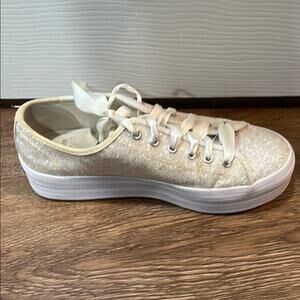 Sparkling cream sneakers with lace-up design. Features glittery finish and comfortable sole. Some minor scuffs from wear.