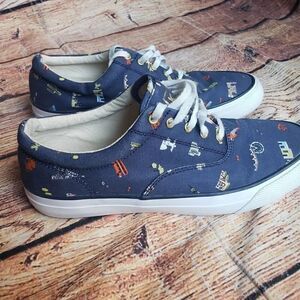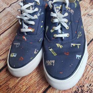 These Navy canvas lace up sneakers are from a Rifle Paper Co. x Kids collaboration. They are canvas uppers and a rubber sole.