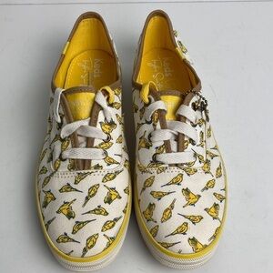 Keds + Taylor Swift Championship Finches Sneakers. Creamy white, bright yellow interior and yellow and blue all-over bird pattern. Sold-out Deadstock Shoes, Size 6.