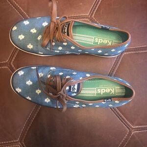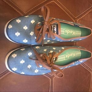 Super cute, like new Keds. These are blue fabric with white ikat design. These have a brown trim and laces. These fit a bit small, I would call these a 5.5 not a 6!