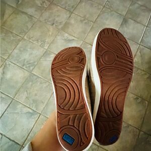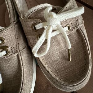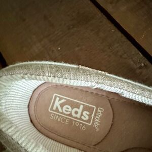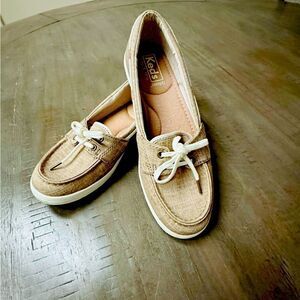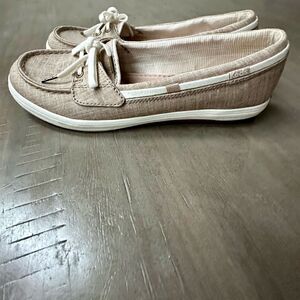 Step out in comfort and style in these tan canvas with white trimmed loafer/sneakers by Keds. Featuring Ortholite cushioned insoles and rubber outer sole.