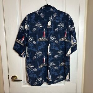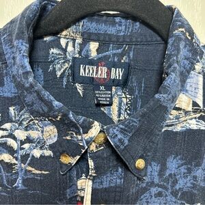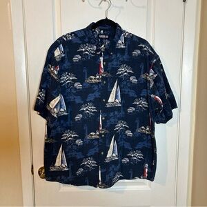 Keeler Bay men's XL button-down shirt in navy blue with a sailboat beach scene