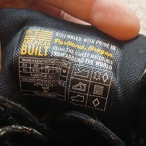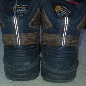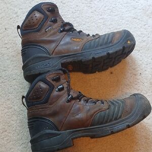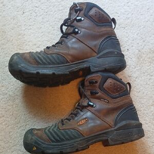 These Keen boots are crafted for durability and protection, featuring a rugged rubber toe cap and a thick, sturdy sole. The high-top design ensures a secure fit with metal eyelets and hooks, while the brown leather upper offers water resistance and style. Ideal for outdoor activities, these boots are built to withstand tough conditions.