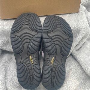Stylish Keen sandals. Black base with purple accents. Comfortable and durable.