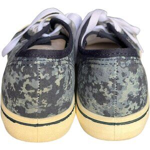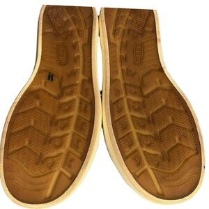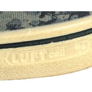 In nice preloved condition - upper has little to no wear, and there is very little wear on the sole. There is a stain on the inside of the upper at the left heel. The outsole has yellowed, there is a stain on one side. There is an "H" in ink on the sole. In insole was removed and washed with Dawn antibacterial soap. I replaced the laces because one of the original ones were worn. These laces are a bit long, but they're new and strong.