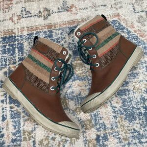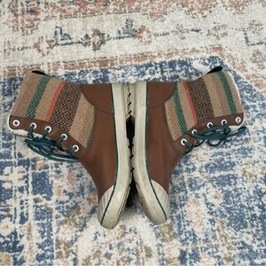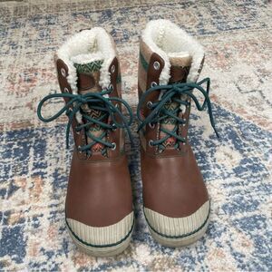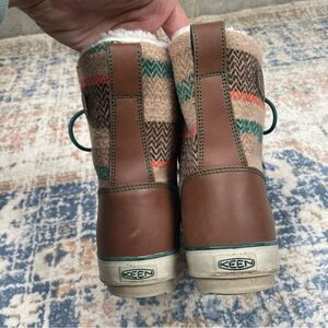 These Keen Elsa Sherpa lined boots are in great used condition. Some light scuffing, but overall very good. Women’s size 9.5. Green laces and brown leather upper.