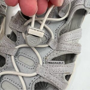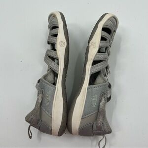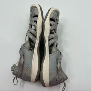 Size big kid 4 silver sparkly closed toe sandals. There is some cosmetic staining as shown, but they were very minimally worn on one vacation. Lightweight and great for outdoors.