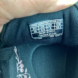 Keen shoes, women's footwear, black leather shoes, size 8.5, lace-up shoes, comfortable walking, casual shoes, women's sneakers, sturdy shoes, everyday wear, stylish footwear, padded collar, floral insole