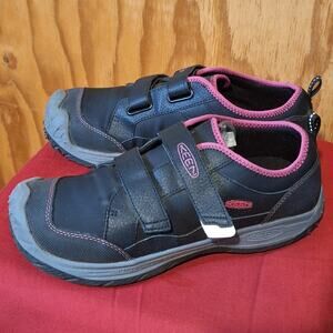 These sneakers from Keen are in excellent preowned condition - no flaws and show light wear. Black with Pink Trim. Adjustable Strap Closure. Washable. Textile and Other Materials. Size 6.