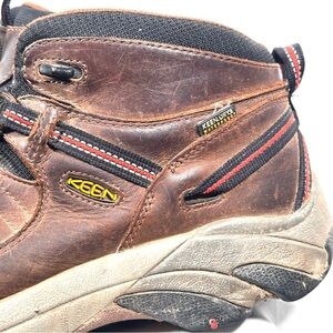 ✨ Color: Brown leather with black mesh accents, red + black webbing details, KEEN logo + waterproof tag