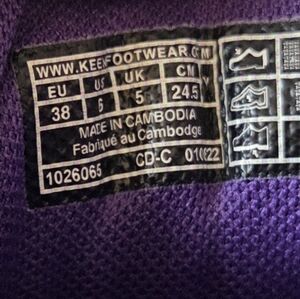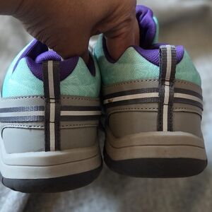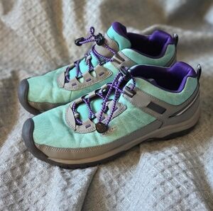 Stylish and sturdy athletic shoes by Keen. Aqua and violet design. Perfect for active lifestyles.