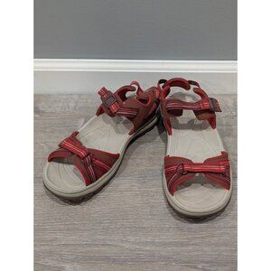 Keen Terradora II Sandals Womens Sz 9.5 Red Adjustable Open Toe Water Sport Shoe. Please see attached pictures for condition. General wear and slight discoloration on the shoe beds. The soles are in great condition. Please let me know if you have any questions. Thanks for looking!