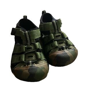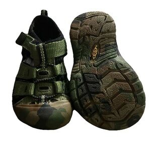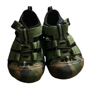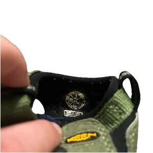 These Keen sandals feature a rugged design with a protective rubber toe cap, perfect for outdoor adventures. The green color and durable construction make them ideal for active wear, while the ventilation cutouts ensure breathability. Designed for water-friendly activities, these sandals offer both comfort and protection.