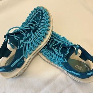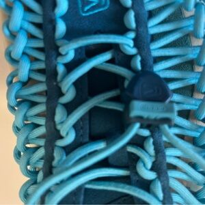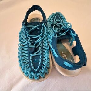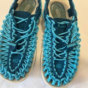 Experience the perfect blend of style and comfort with Keen's blue sandals, featuring a unique woven cord design. These sandals offer a breathable and flexible fit, making them ideal for casual outings. The durable rubber sole ensures reliable traction and support for all-day wear.