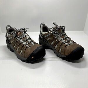 Experience the perfect blend of durability and style with Keen's athletic hiking shoes. These shoes feature a robust black rubber toe cap and a sturdy lacing system, ensuring a secure fit for any outdoor adventure. Crafted with a combination of leather and synthetic materials, they are designed to withstand rugged terrains while providing comfort and support. These shoes are in exceptional condition. They Don’t look like they’ve been worn at all. See photos for details. Also feel free to request more information and or make me an offer.