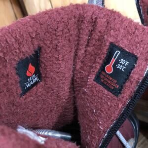 Previously loved in great condition, light wear on the upper and soles with lots of life left. Red quilted textile/tan leather, insulated, waterproof, women’s size 6