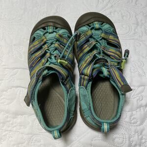 Keen water friendly sandals in turquoise and stripes. Good condition, some overall wear. Big Kids Size 3.