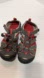 Keen waterproof washable sandals, round toe with reinforced toe cap, adjustable toggle lace system, synthetic upper and rubber sole. Durable and comfortable sandals perfect for outdoor adventures. Featuring a stylish gray and red design, these sandals offer excellent support and grip.